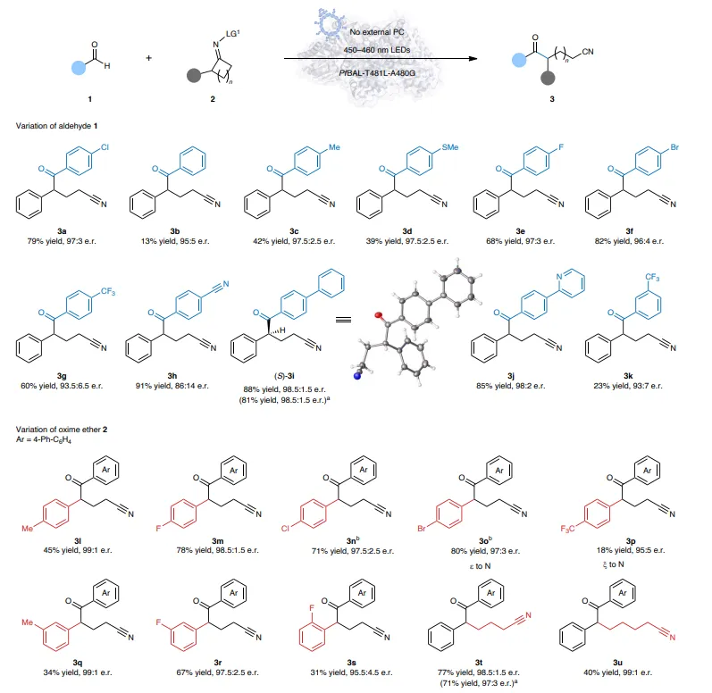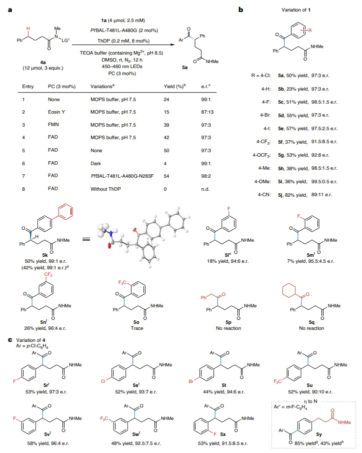以4-氯苯甲醛为酰基供体、2-苯基环丁酮肟醚为自由基前体,在硫胺素依赖性酶PfBAL‑T481L‑A480G催化下,经过条件优化,在无外加光催化剂、蓝光照射、TEOA缓冲液(pH 8.5)中,实现了C–C键的断裂与远程酰化,以79%收率和97:3 e.r.获得产物。研究发现,光照射能显著提升反应效率(暗态下仅34%收率),而酶活性口袋对反应的对映选择性起关键作用。