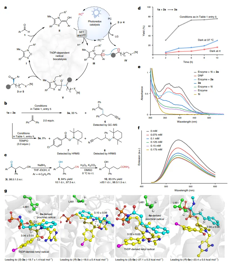 通过自由基捕获实验(TEMPO、1,1‑二苯乙烯)证实了自由基中间体的存在。紫外‑可见吸收与荧光猝灭实验表明,在C–C酰化中,原位生成的2,4‑二硝基苯酚可能作为内源性光敏剂;而在C–H酰化中,FAD通过还原猝灭路径促进单电子转移。分子动力学模拟显示,酶活性口袋中ThDP衍生的酰基自由基与迁移后的碳自由基距离约3 Å,且生成S构型产物的结合能更低,与实验观察的对映选择性一致。