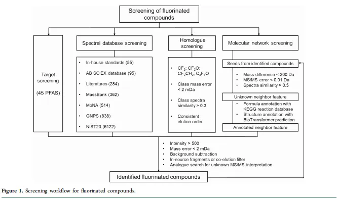 全氟及多氟烷基物质(PFAS)等含氟化合物因持久性和生物毒性引发广泛环境关切,传统 PFAS(如 PFOS、PFOA)已被列入《斯德哥尔摩公约》限制使用,工业界转向短链同系物和含醚类新兴替代化合物,导致环境中含氟化合物种类激增(PubChem 收录超 2100 万种)。然而,现有靶向监测仅能覆盖少数含氟化合物,氟质量平衡分析显示环境中存在大量未识别有机氟,且部分新兴含氟化合物会发生环境转化,其转化产物的风险被忽视,现有非靶向筛查方法存在数据库覆盖不足、同源物筛查假阳性高、分子网络谱库有限等局限,难以全面捕捉含氟化合物的化学多样性。研究目的: