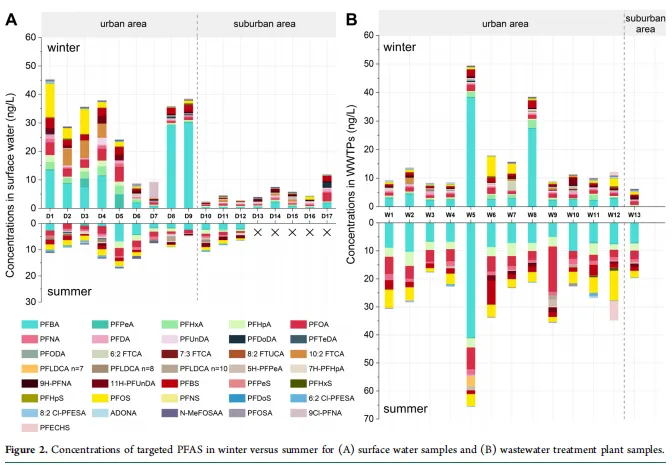 共识别出 106 种含氟化合物,其中 36 种 PFAS 经靶向验证并定量,短链 PFCAs(如 PFBA)和 PFSAs(如 PFBS)为主要污染物,城市区域浓度显著高于郊区,地表水冬季浓度高于夏季(稀释效应),污水处理厂夏季浓度更高(微生物转化和旅游旺季废物负荷增加);非靶向筛查发现表面活性剂、药物、农药、工业中间体及其转化产物等,其中 23 种为首次报道,包括 7 种卤代芳香中间体、3 类新型氟调聚醚羧酸的 9 种同源物、7 种分子网络揭示的转化产物 / 结构类似物;污水处理厂是含氟药物及其转化产物的重要排放源,部分新型化合物(如氟调聚醚羧酸)可能源于氟调聚乙氧基化物的生物转化,后者在新冠疫情期间因防雾产品使用增加而广泛存在。结论: