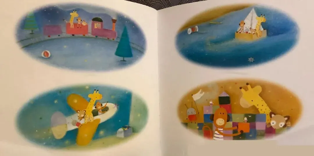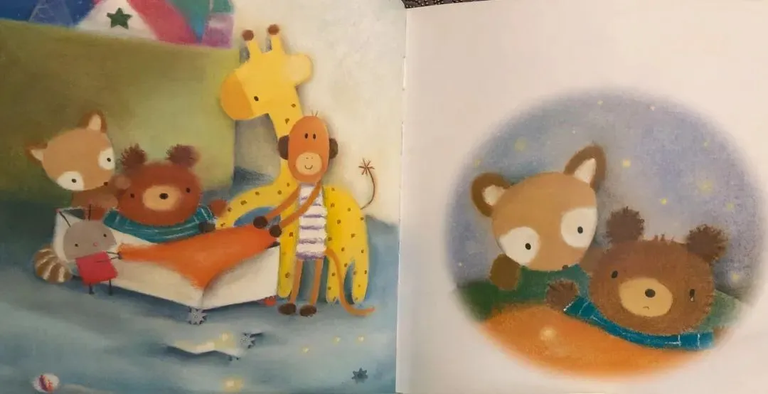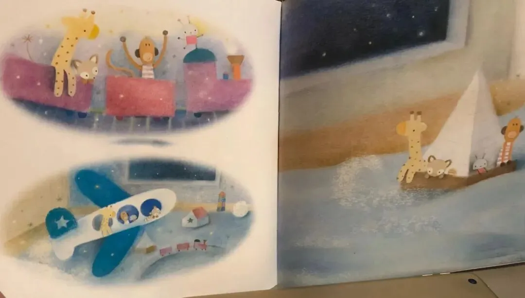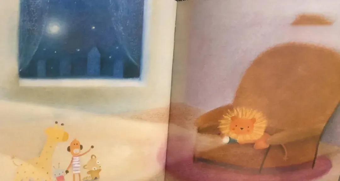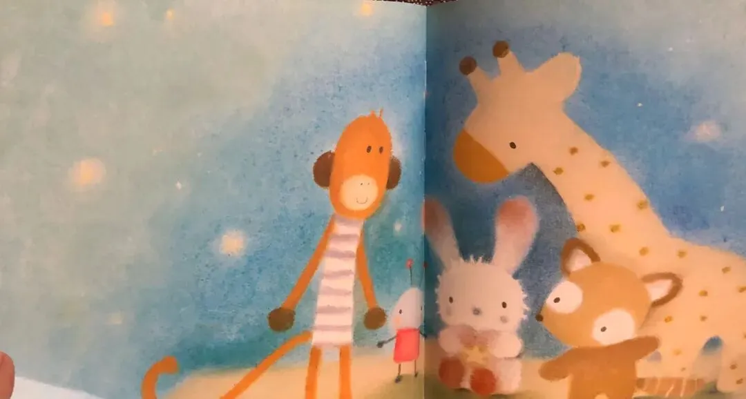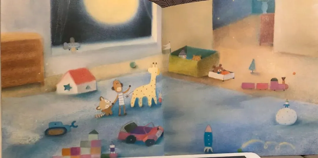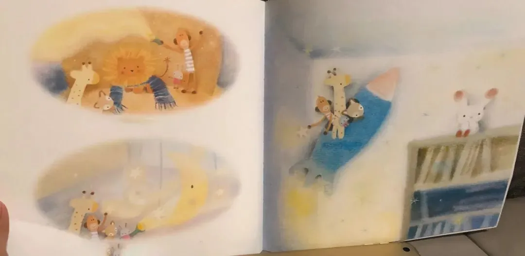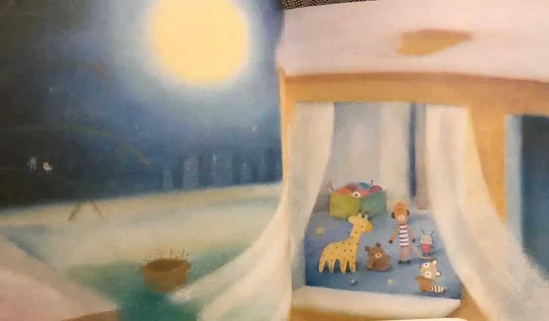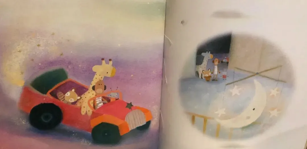 于是,敢于冒险的玩具们坐着快散架的旧玩具车。去寻找星星了。在婴儿房里,它们看见一个闪闪发光的月亮上系着好几颗星星。