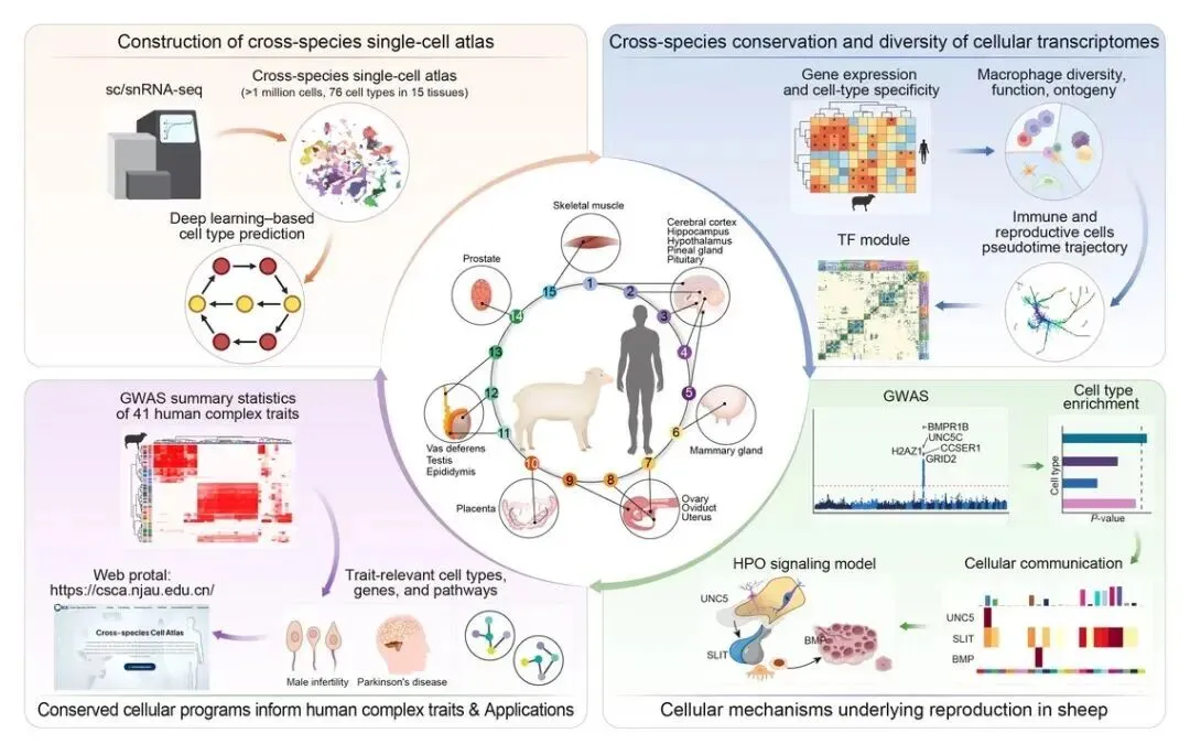 研究通过构建跨物种、多组织的单细胞图谱(https://csca.njau.edu.cn/),将遗传变异精确定位到特定的细胞类型和信号通路,真正实现了从“遗传位点”到“细胞类型”再到“生物学功能”的机制解析,为揭示哺乳动物生殖调控的进化规律提供了新视角。相关成果不仅为肉羊精准育种与繁殖性能提升提供了重要工具,也为人类生殖健康与复杂性状的跨物种比较研究奠定了理论基础。