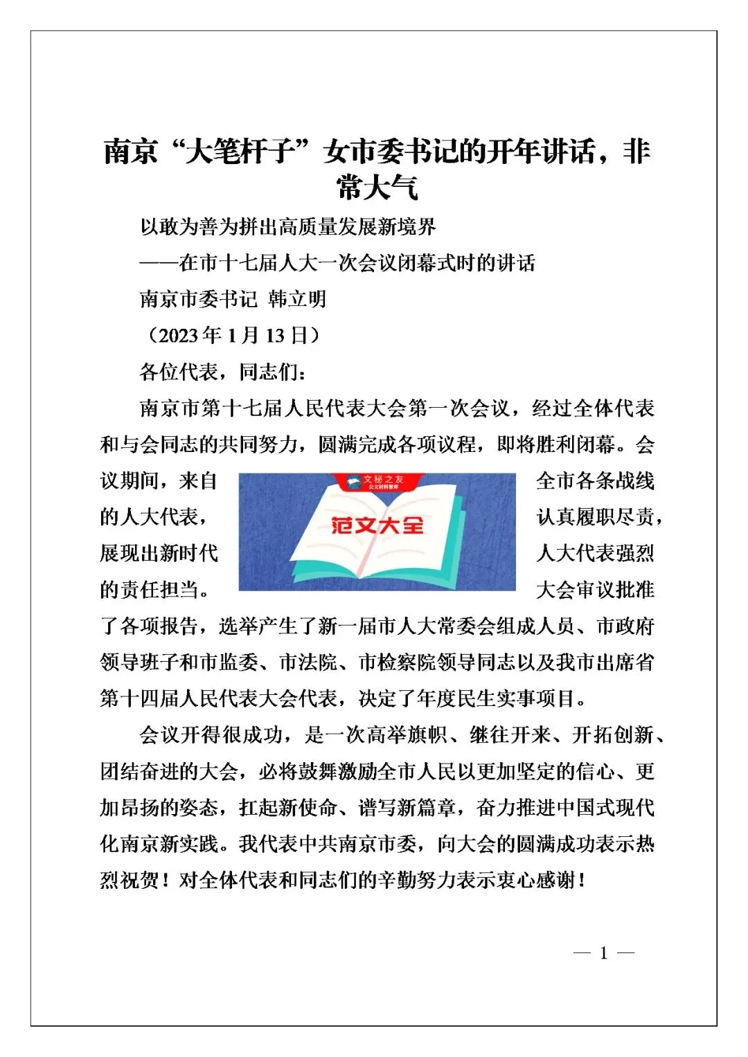 今天这篇《南京“大笔杆子”女市委书记的开年讲话,非常大气》我读了后,确实让读者眼前一亮。韩立明书记的讲话不是那种空喊口号的套话,在我看来是有温暖、有力度、有格局。她把“敢为善为”作为核心主线,贯穿始终,这个立意抓得准,呼应了中央精神,结合了南京实际,【划重点】特别实在。