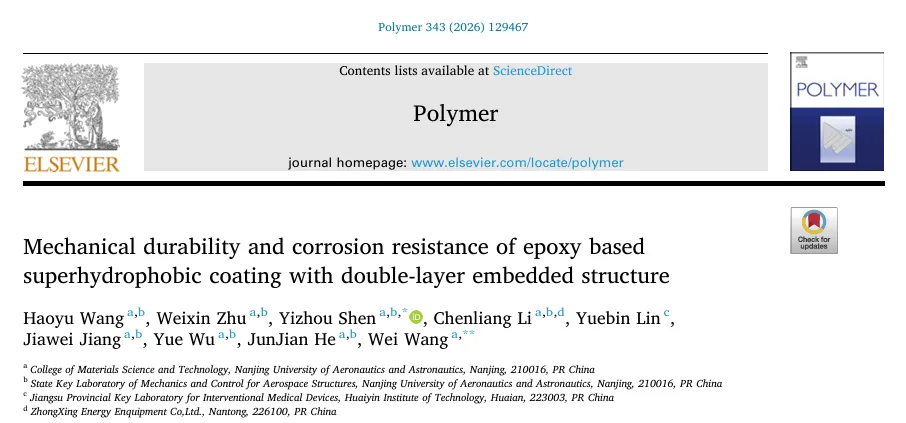 【引用格式】Wang H, Zhu W, Shen Y, et al. Mechanical durability and corrosion resistance of epoxy based superhydrophobic coating with double-layer embedded structure[J]. Polymer, 2026, 343: 129467.