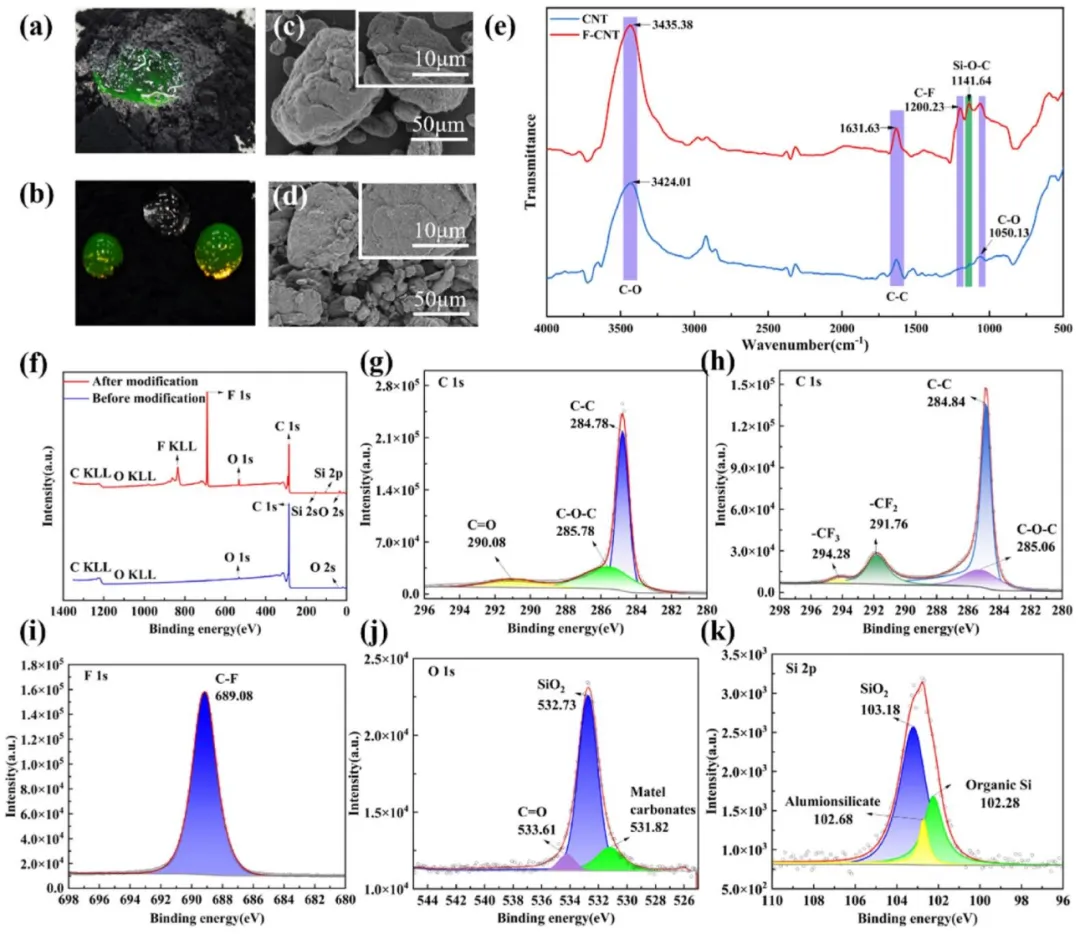 图3. (a) 水滴在改性前纳米颗粒上的状态;(b) 水滴在改性后纳米颗粒上的状态;(c) 改性前纳米颗粒的微观形貌;(d) 改性后纳米颗粒的微观形貌;(e) 纳米颗粒改性前后的 FTIR 光谱;(f) 纳米颗粒改性前后的 XPS 全谱;(g) CNT 的高分辨率 C 1s 谱;(h) F-CNT 的高分辨率 C 1s 谱;(i) F-CNT 的高分辨率 F 1s 谱;(j) F-CNT 的高分辨率 O 1s 谱;(k) F-CNT 的高分辨率 Si 2p 谱。