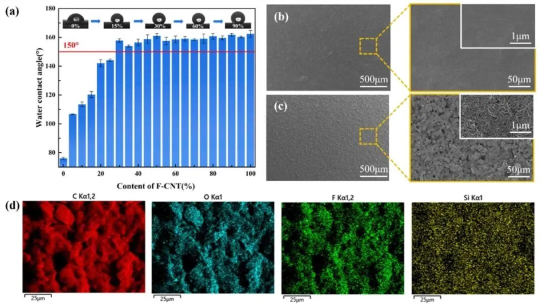 图4.(a) FCEC 接触角与 F-CNT 含量的关系;(b) 纯环氧树脂表面的微观形貌;(c) F-CNT 含量为 30% 时的微观形貌;(d) FCEC 表面的 EDS 分析。