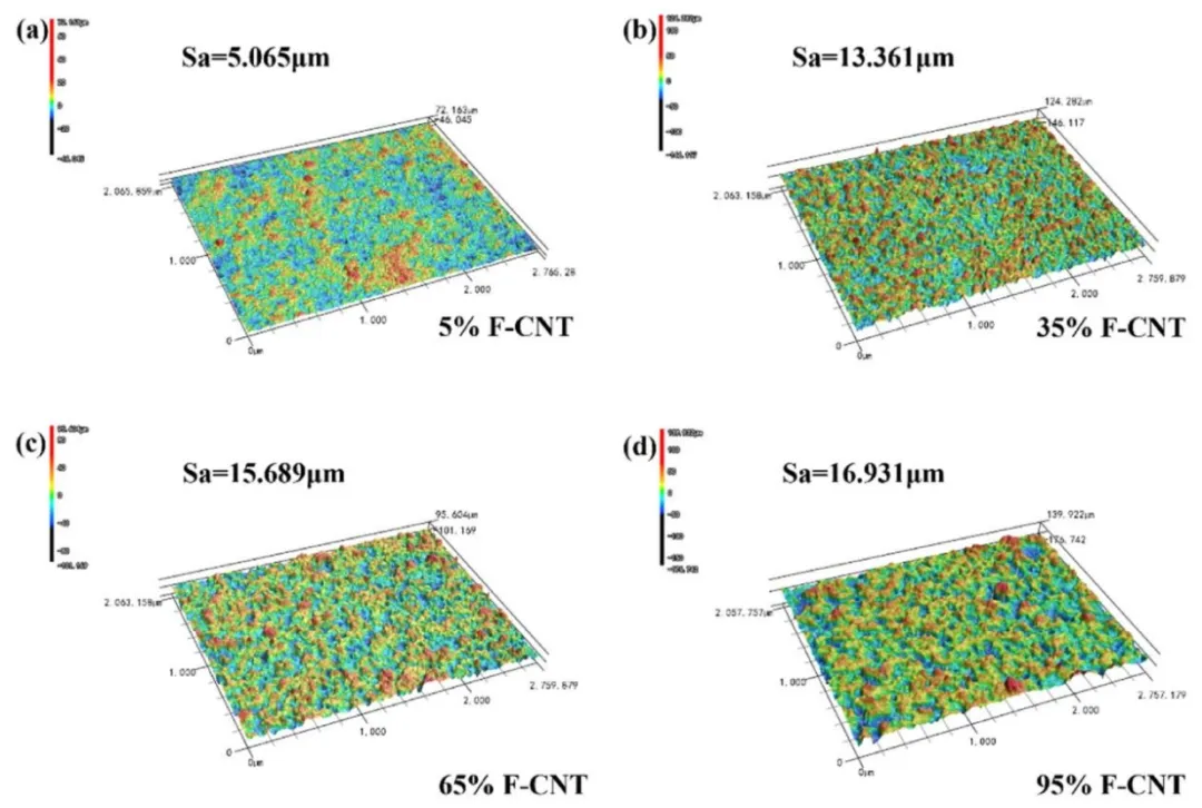 图5.(a–d) 不同 F-CNT 含量下的三维形貌图像。