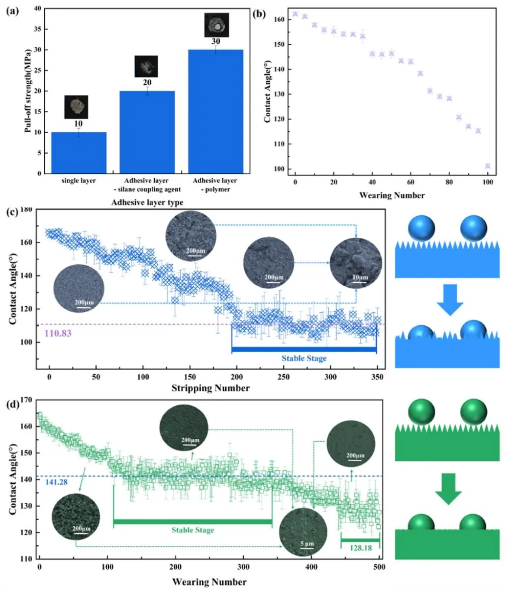 图6.(a) 不同粘结层的拉拔强度;(b) 以硅烷偶联剂为粘结层的耐磨测试;(c) 胶带剥离试验及胶带附着力损失示意图;(d) 摩擦磨损试验及摩擦损失示意图。