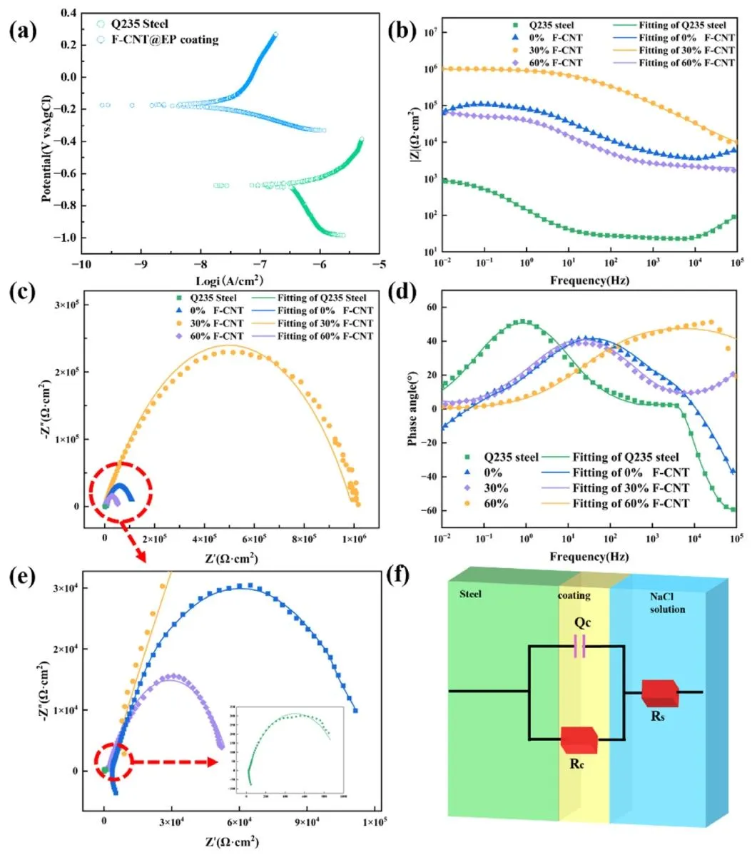 图 7:(a) FCEC 在 3.5% NaCl 溶液中的极化曲线;(b, d) 超疏水涂层的电化学阻抗谱 Bode 图;(c, e) 超疏水涂层的电化学阻抗谱 Nyquist 图;(f) Q235/EP/30%/60% 样品在 3.5 wt% NaCl 水溶液中浸泡后的等效电路模型。