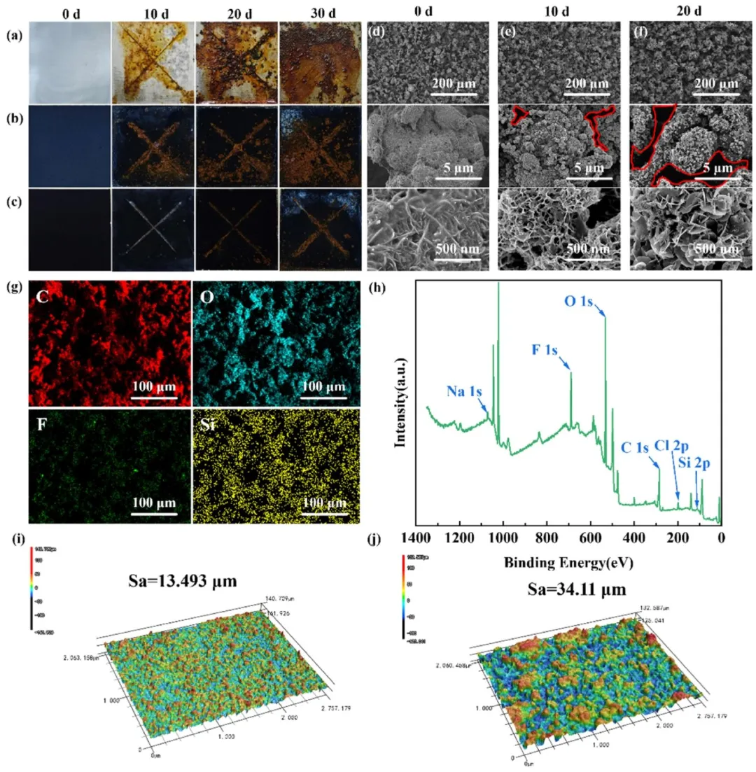 图 8:(a–c) 不同时间段的盐雾试验照片;(d–f) 盐雾试验前后样品的表面形貌;(g) 盐雾试验前后表面元素分布;(h) 盐雾试验后涂层表面的三维形貌图像;(i) 盐雾试验后涂层表面的 XPS 分析。