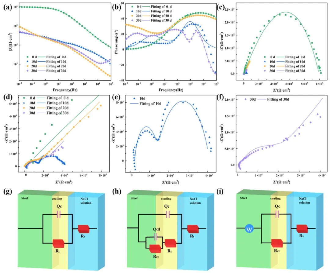 图 9:(a, b) 盐雾腐蚀后超疏水涂层的电化学阻抗谱 Bode 图;(c–f) 盐雾腐蚀后超疏水涂层的电化学阻抗谱 Nyquist 图;(g) 盐雾试验前样品在 3.5 wt% NaCl 水溶液中的等效电路模型;(h) 10 天盐雾试验后样品在 3.5 wt% NaCl 水溶液中的等效电路模型;(i) 20 天和 30 天盐雾试验后样品在 3.5 wt% NaCl 水溶液中的等效电路模型。