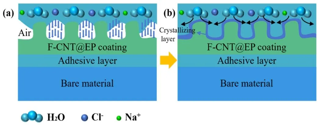 F-CNT 既降低表面能,又构建微纳乳突结构,形成 “空气 cushion”,显著阻碍腐蚀介质渗透。