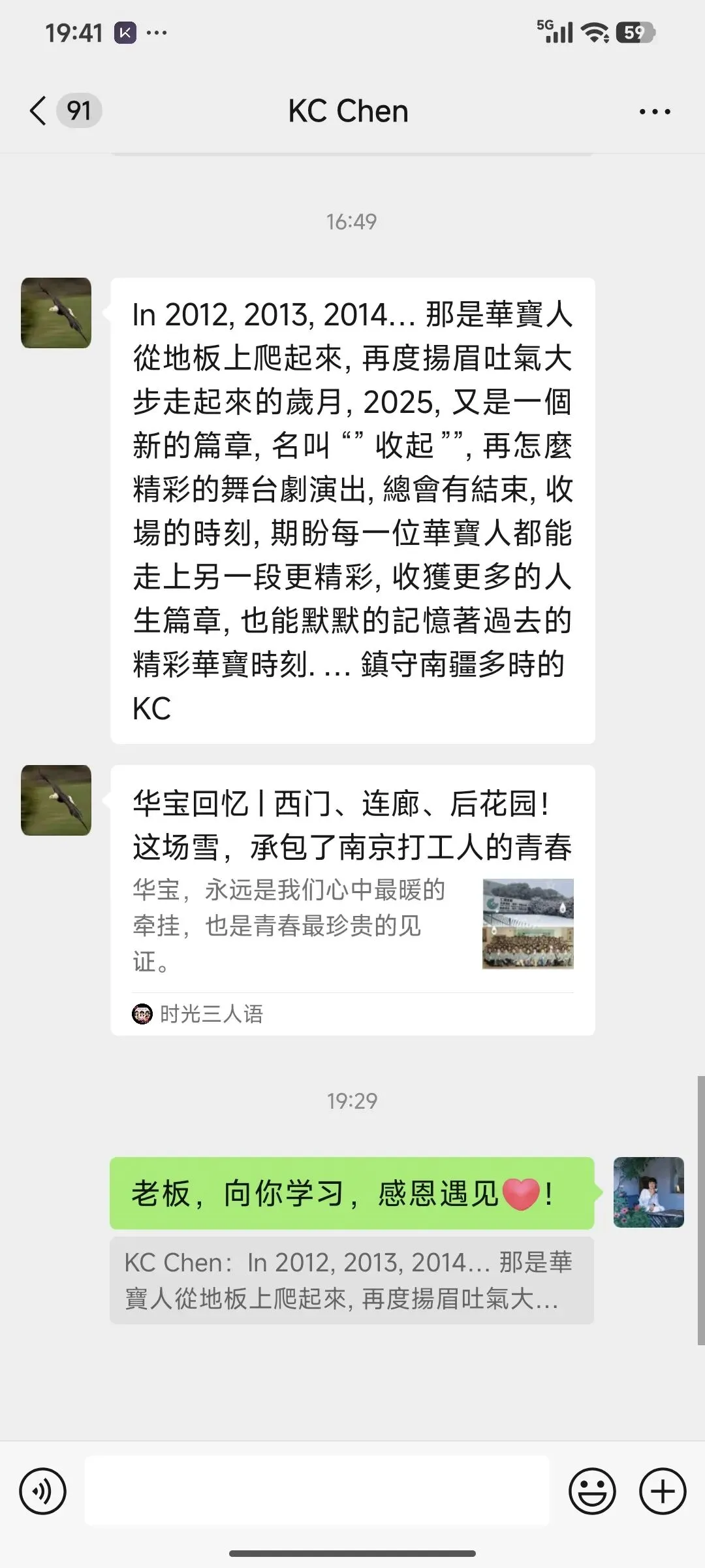 最让我感动的是KC老板的留言,他说:“期盼每一位華寶人都能走上另一段更精彩,收穫更多的人生篇章,也能默默的記憶著過去的精彩華寶時刻。”