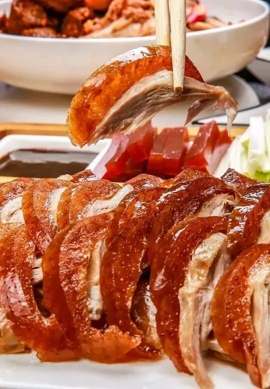每家烤鸭店的卤汁配方都是机密,大致有酱油、糖、香料和烤鸭时滴下的鸭油。咸中带甜,甜中有鲜,还带着果木的烟熏香。