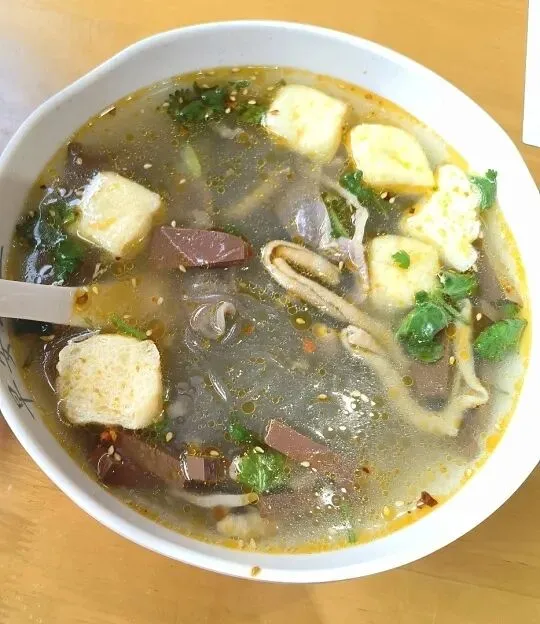 先喝一口汤,鲜香醇厚;再吃一口鸭血,嫩滑如豆腐;粉丝吸饱了汤汁,滑溜顺口;偶尔咬到一块鸭肠,脆生生地增加口感层次。