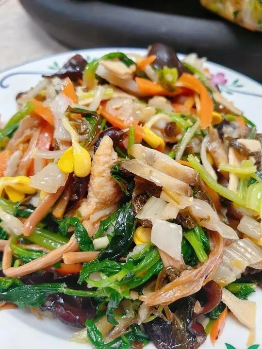 顾名思义,这道菜由至少十种蔬菜炒制而成:荠菜、菠菜、胡萝卜、木耳、黄花菜、豆芽、芹菜、藕片、雪里蕻、香菇……每种都有吉祥寓意。