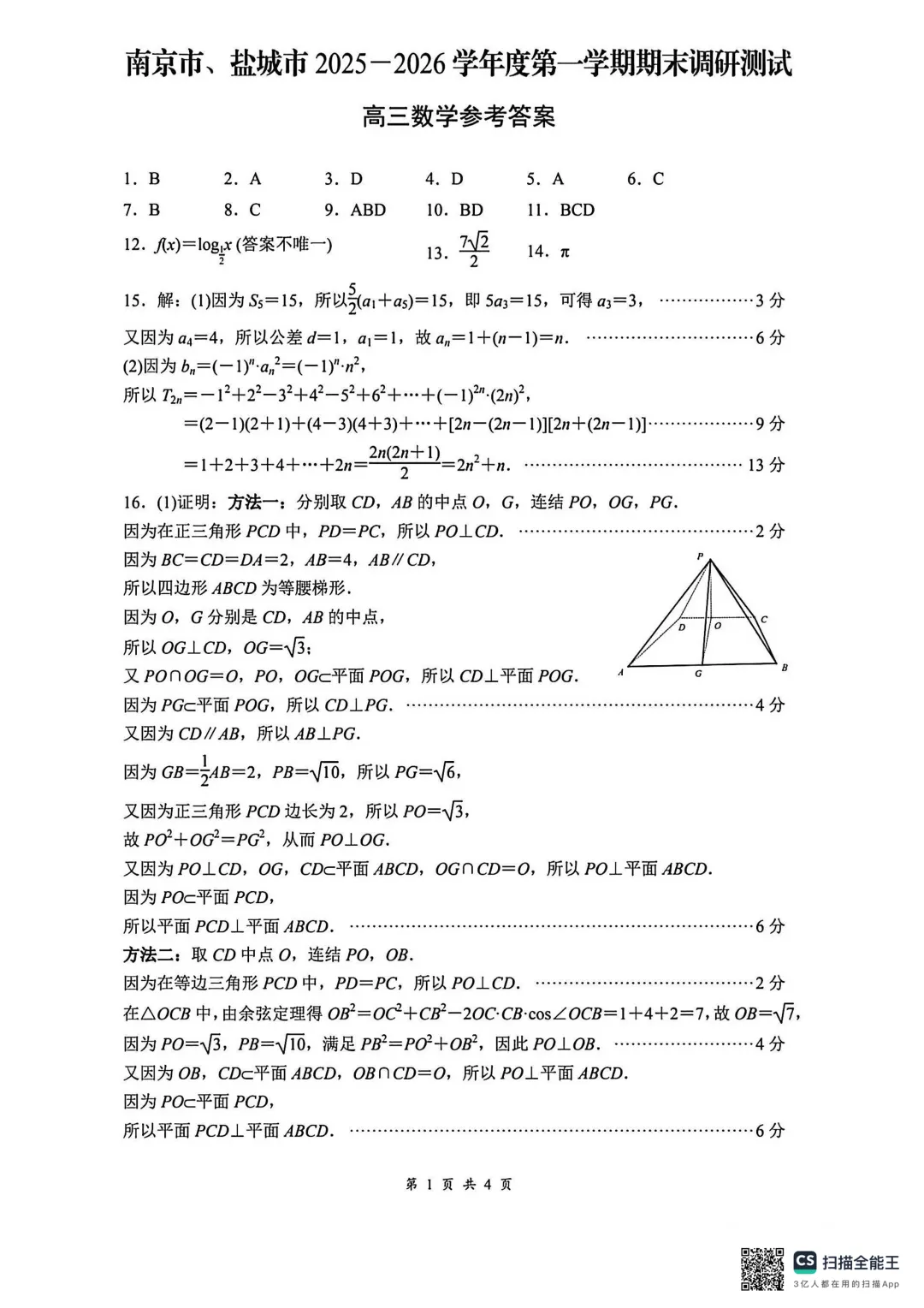 >江苏省南京市盐城市期末调研测试2026届高三数学试卷