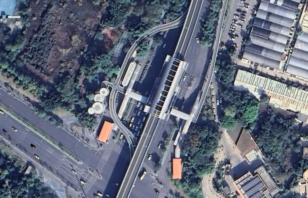 然后在高架两个方向的中间设置站台,乘客通过高架下方的天桥实现街道两侧地面与高架BRT站点的往来。