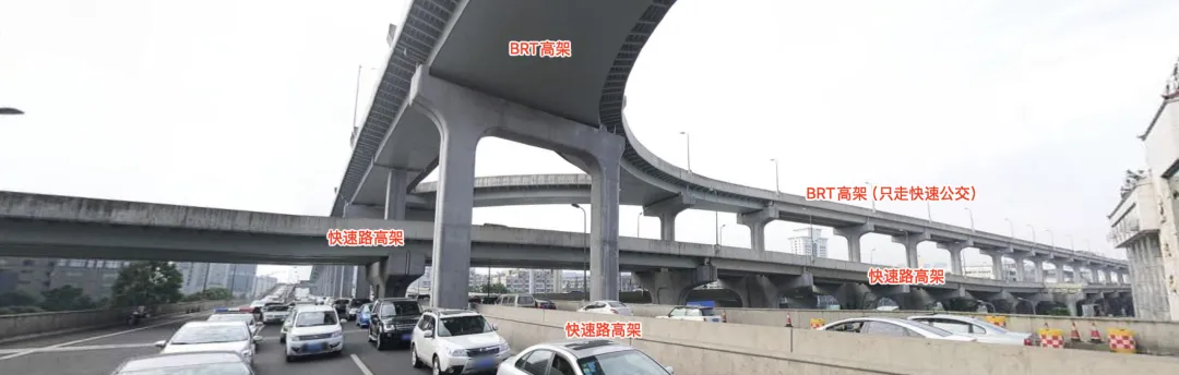 成都BRT更多和快速高架合体,通常将最左侧的快车道让给公交车专用,有些路段也会有专用于BRT公交的单独高架。