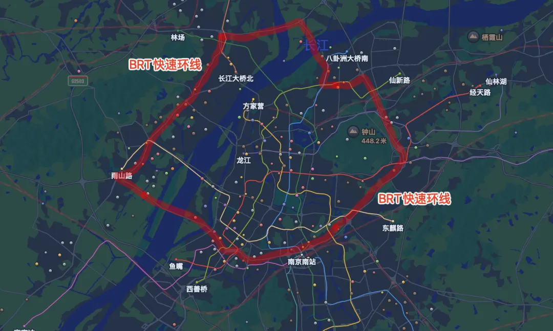 南京完全可以大致沿着绕城公路环线(快速一环)也设置一条BRT,不管是高架、隧道还是平地,都把快车道独立划给快速公交,并在合适的点位设置站点。