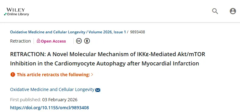 2026年2月3日,期刊正式发布撤稿声明。声明依据国际出版伦理委员会(COPE)的准则,指出由于已确定的数据问题,论文的结论不再有效。这意味着,这项关于IKKε在心梗后自噬中作用机制的“新发现”,从学术记录中被撤回。