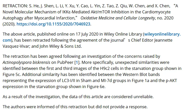 面对确凿的公开质疑,《Oxidative Medicine and Cellular Longevity》期刊主编与出版商威立(Wiley)启动了正式调查。调查结论支持了质疑者的发现,确认论文中报告的图像数据存在无法解释的相似性问题,导致整体数据的可靠性受到根本性质疑。