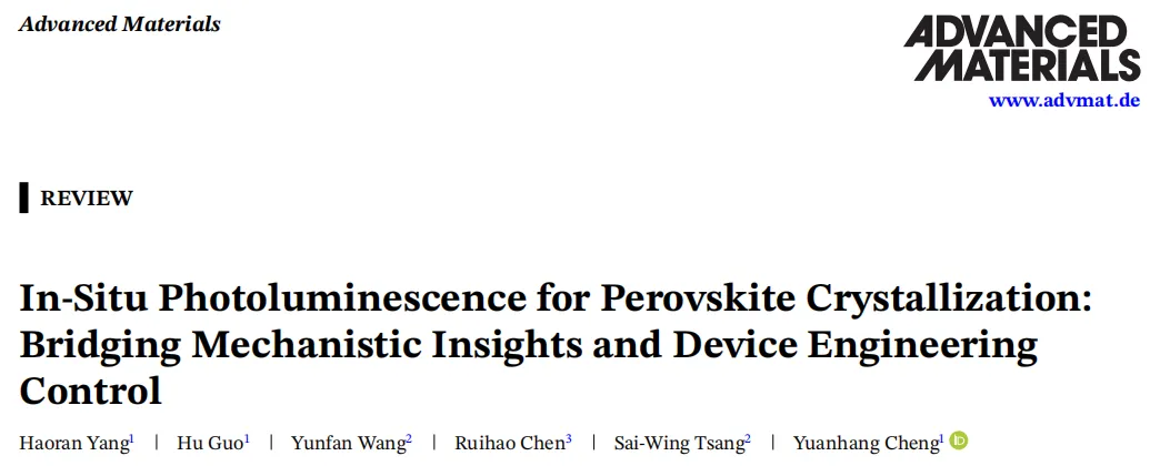 题目:In-Situ Photoluminescence for Perovskite Crystallization: Bridging Mechanistic Insights and Device Engineering Control作者:Haoran Yang, Hu Guo, Yunfan Wang, Ruihao Chen, Sai-Wing Tsang, Yuanhang Cheng接受日期:First published: 08 February 2026原文链接:https://doi.org/10.1002/adma.202518643