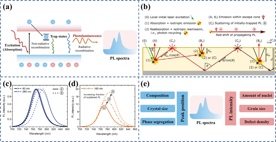 图1 原位光致发光技术的工作原理 (a) 光致发光光谱原理示意图。(b) 钙钛矿薄膜中辐射过程(编号)与光致发光路径(字母标注)的示意图。(c) 使用装置(1)(共聚焦微光致发光)和装置(2)(积分球)从80 nm和260 nm厚的MAPbI3薄膜获取的归一化光致发光光谱。(d) 从160 nm厚的MAPbI3薄膜获得的光致发光光谱,其中装置(1)共聚焦光致发光装置仅检测窄视场内发射的光致发光,(2)标准积分球(IS)装置捕获所有发射的光致发光,(3)改进的IS装置检测总前沿发射,所有信号均归一化至730 nm处的强度。(e) 光致发光光谱提供的波长和强度信息。
