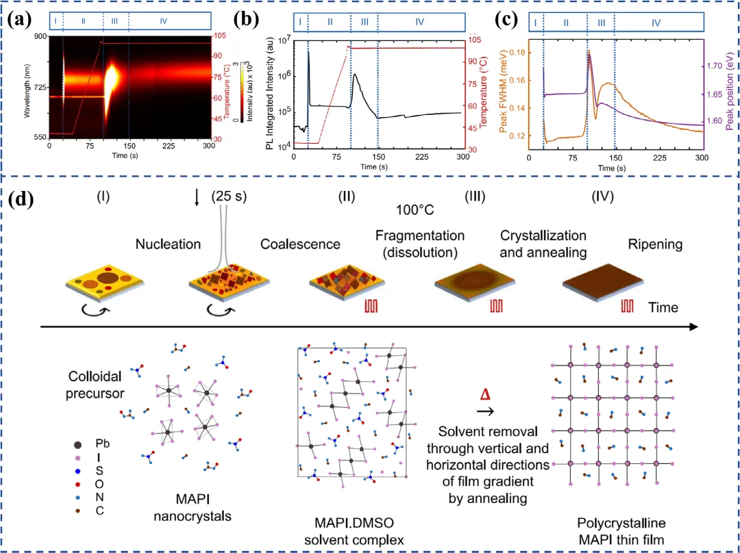 图3 通过原位PL光谱研究MAPbI3的成核与结晶动力学。(a)记录了MAPbI3的原位PL光谱及其基底温度在四个阶段的变化。(b)提取的MAPbI3的PL强度。(c)MAPbI3的PL峰位置及半高全宽(FWHM)的演变。(d)自旋涂布及后续热退火过程中MAPbI3钙钛矿结晶机制的示意图。