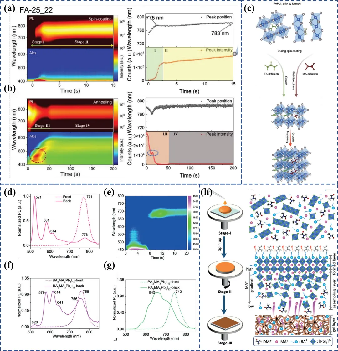 图5 通过原位光致发光光谱技术探究混合阳离子钙钛矿的成核与结晶动力学过程,展示(a)旋涂工艺与(b)热退火过程中对应峰位及峰强度的演变规律。经授权转载。(c)基于原位光谱结果提出的FA0.25MA0.75PbI3钙钛矿结晶路径示意图。(d)BA2MA3Pb4I13钙钛矿薄膜正反面测得的光谱图。(e)BA2MA3Pb4I13钙钛矿薄膜旋涂过程中的原位光谱。(f)(g)BA2MA3Pb4I13与PA2MA3Pb4I13钙钛矿薄膜正反面测得的光谱图。(h)BA2MA3Pb4I13从前驱体到钙钛矿的结晶机理示意图。