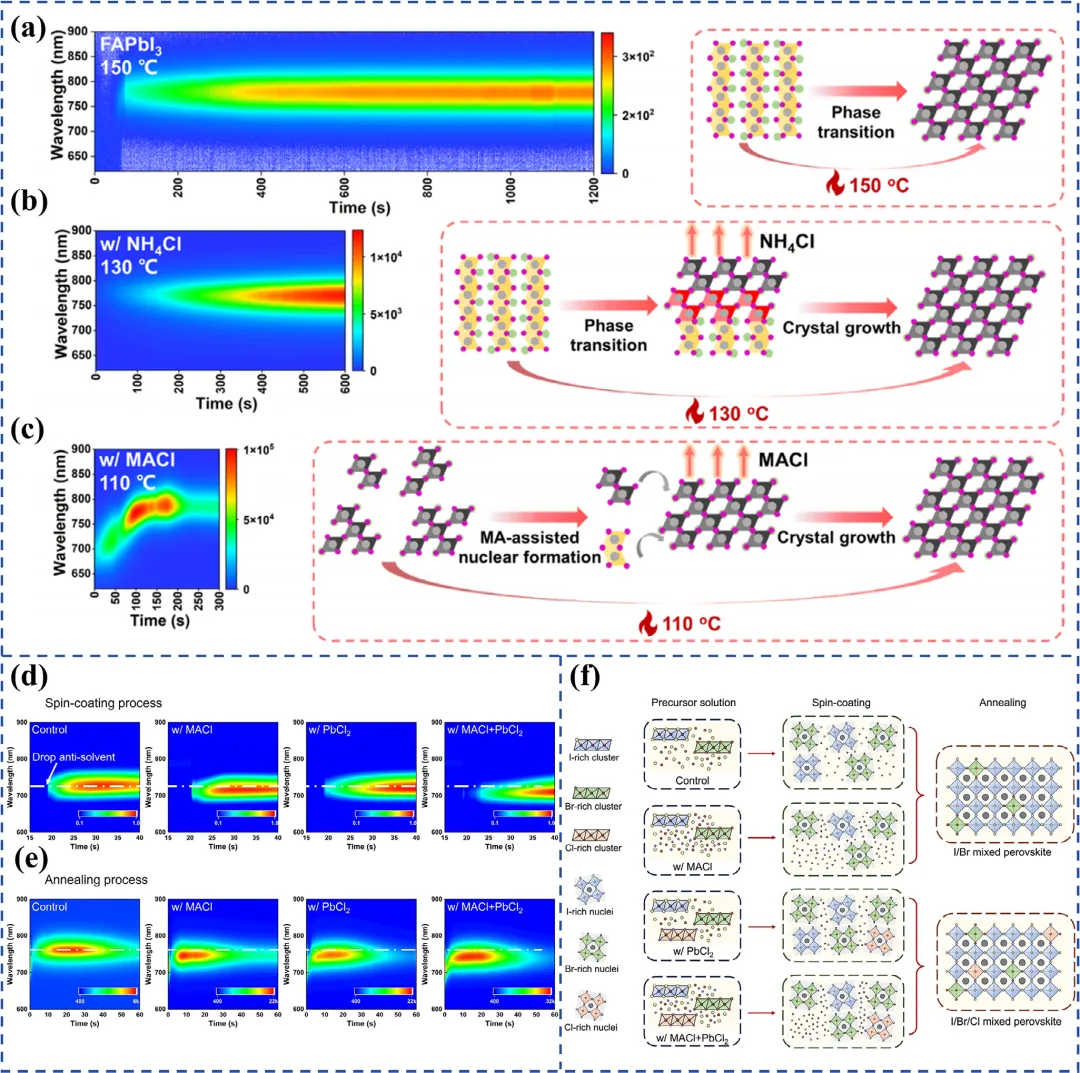 图8 通过原位光致发光技术揭示氯化物基添加剂在钙钛矿结晶动力学中的作用。(a)对照薄膜、(b)含氯化铵薄膜、(c)含MACl薄膜的原位光致发光光谱及钙钛矿结晶过程示意图。对照薄膜与添加剂改性钙钛矿薄膜(MACl、氯化铅及MACl + 氯化铅)的原位光致发光光谱:(d)旋涂过程中、(e)退火过程中。(f)对照薄膜与添加剂改性钙钛矿薄膜的结晶过程示意图。
