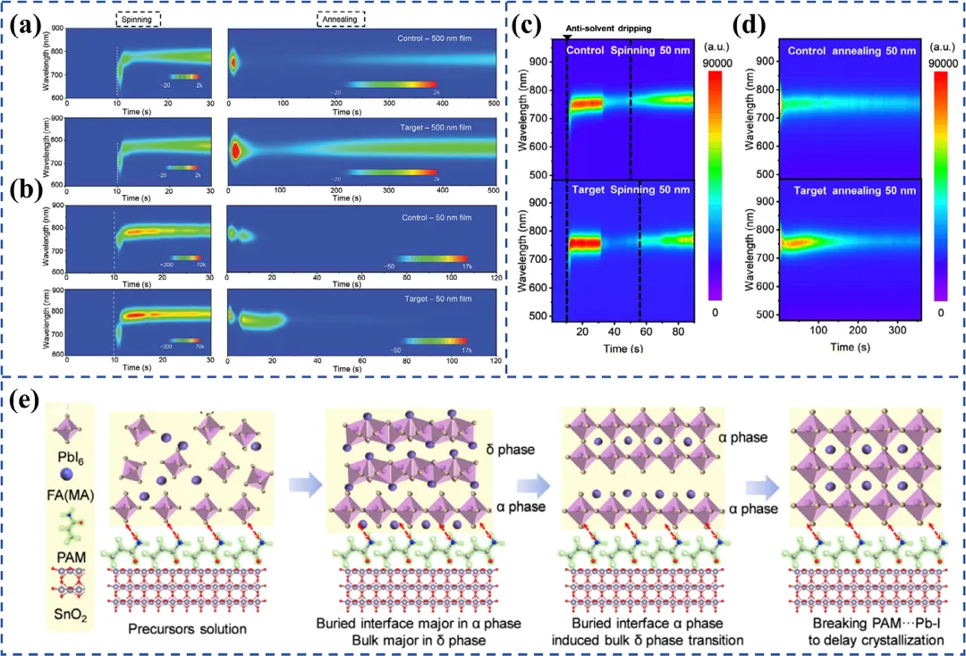 图10 通过原位光致发光技术揭示界面工程对钙钛矿薄膜结晶的影响。对比分析了自旋涂布与退火处理过程中对照组和SZC改性钙钛矿薄膜的原位光致发光光谱:(a) 500纳米薄膜厚度组,(b) 50纳米薄膜厚度组。对比展示PAM改性钙钛矿薄膜的原位光致发光光谱:(c) 自旋涂布阶段,(d) 退火阶段。(e) PAM改性钙钛矿结晶过程示意图。