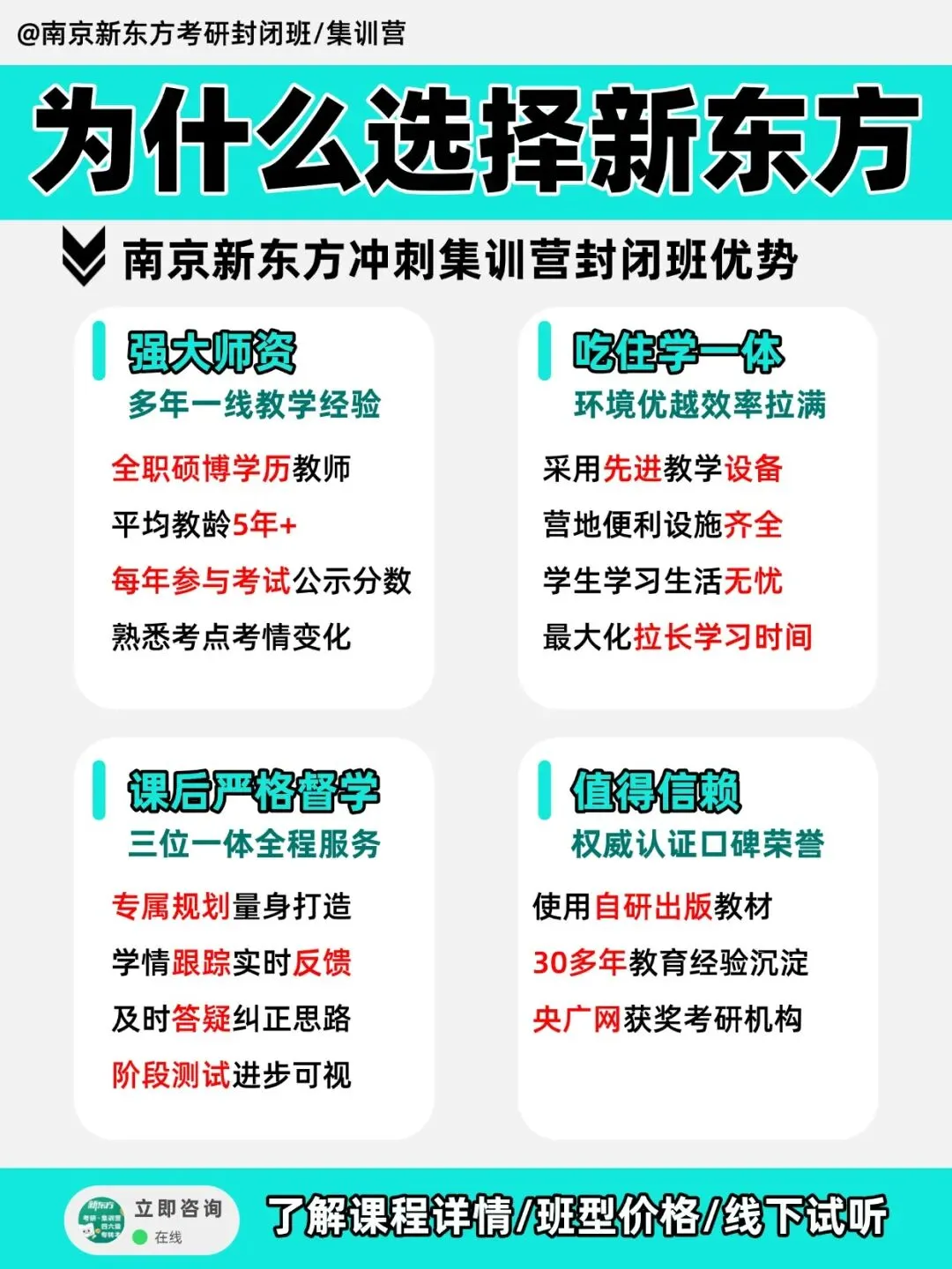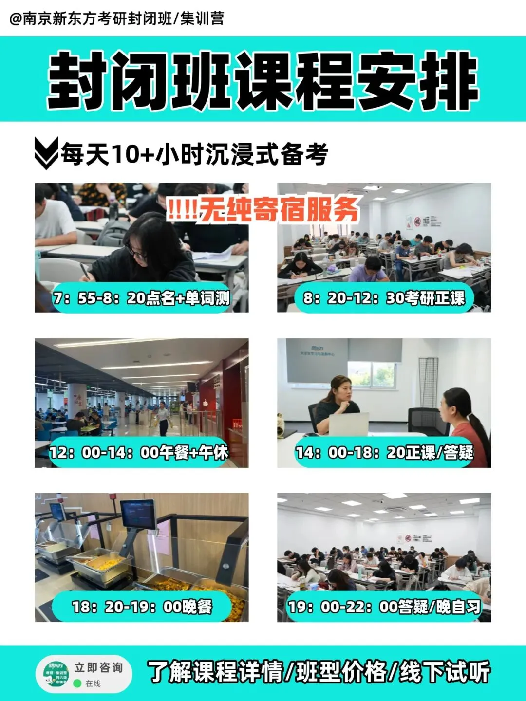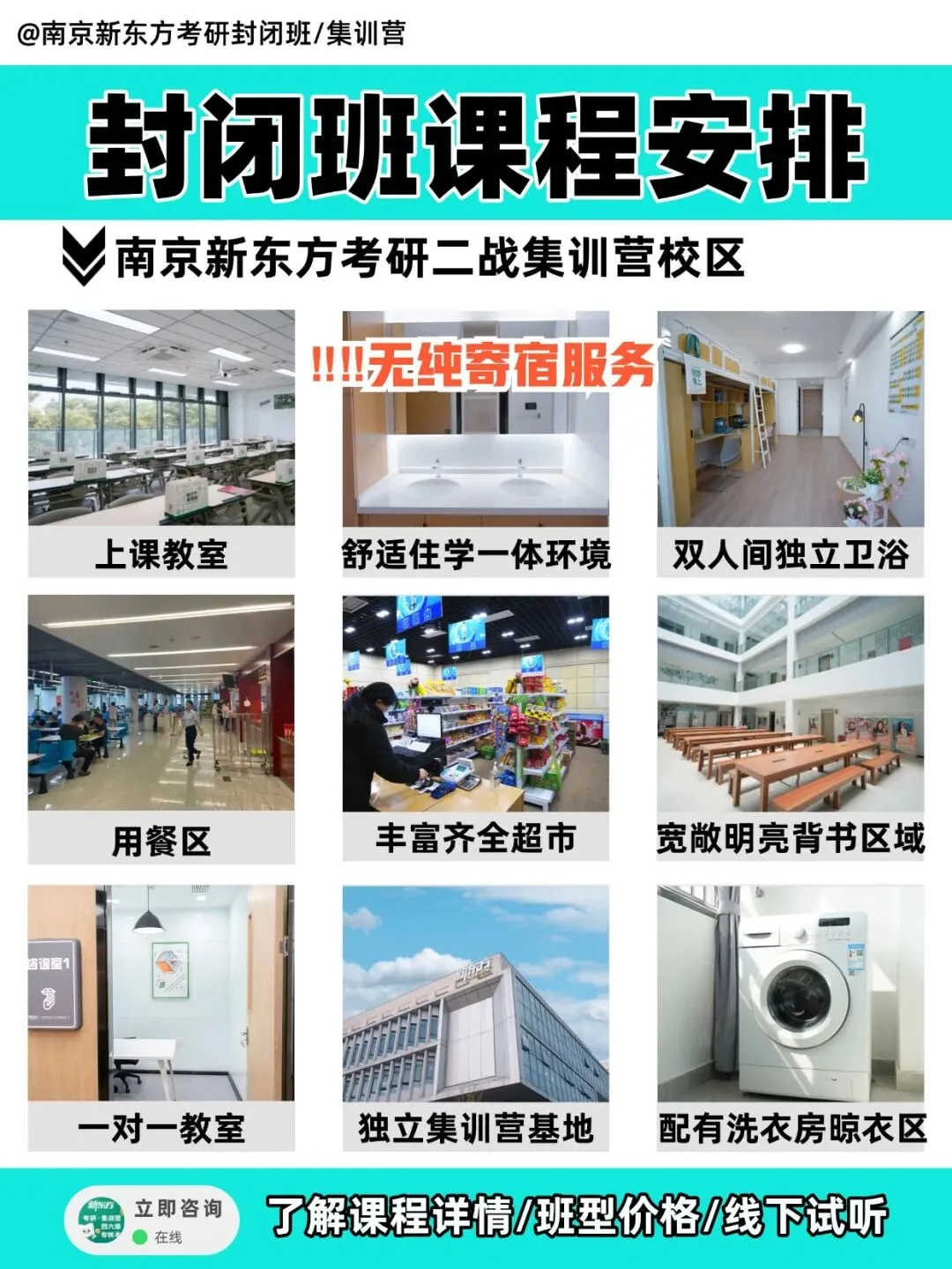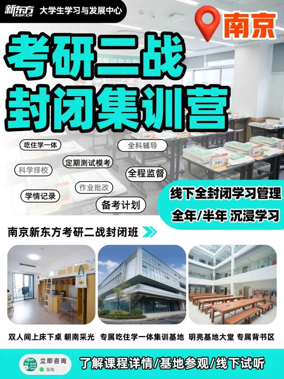 ‼️南京新东方强势推出『27考研全科集训营』‼️🔥目前热招课程:✅27考研:全年集训营、寒暑集训营、半年集训营①干净的校区环境: 各校区均有宽敞明亮的大教室,并配备安静整洁的专属自习室、休息区、背书角。冬夏空调给劲,配套设施齐全,打好同学们学习的基本保障。②集训营住宿环境: 酒店式居住标准敞亮双人间,大阳台+独立空调+私人储物柜+独立卫浴+WiFi通通配齐,环境舒适整洁,定期打扫卫生,提供舒适的休息环境③就餐环境: 校区上岸食堂每日提供三餐,同时配备水吧!好吃好喝的超多,突出的就是一个词:方便!