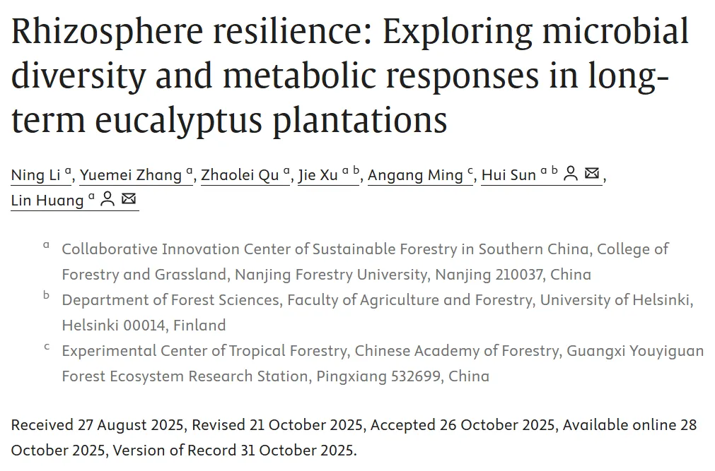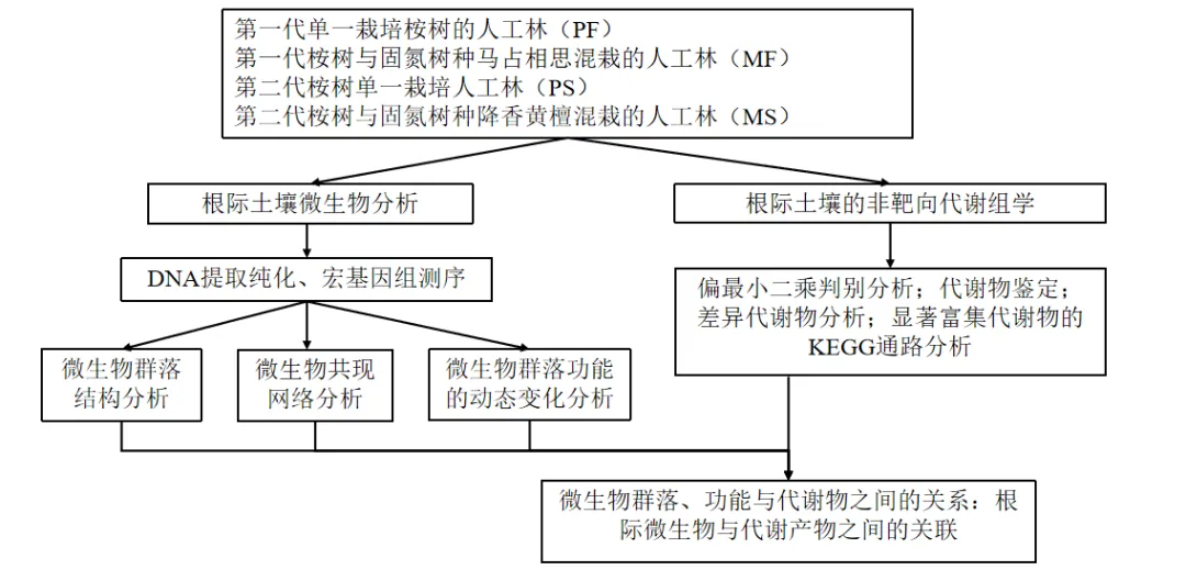 桉树的大规模种植带来了重大的生态挑战,例如土壤微生物多样性下降和土壤退化。为了解决这些问题,已提出了结合固氮物种和调整轮作周期的管理措施。然而,这些措施对根际土壤微生物及其代谢产物的影响仍缺乏充分的了解。本研究采用宏基因组学和非靶向代谢组学技术,探究了不同管理措施下:第一代单一栽培桉树的人工林(PF)、第一代桉树与固氮树种马占相思树混栽的人工林(MF)、第二代桉树单一栽培人工林(PS)和第二代桉树与固氮树种降香黄檀树混栽的人工林(MS),桉树人工林根际微生物及其代谢物的响应。结果表明,与连作人工林相比,混栽人工林增加了微生物多样性。与PF相比,PS中特有微生物种类丧失且微生物群落稳定性降低。参与土壤磷循环的关键芽单胞菌门(相对丰度:PF:0.13%,PS:0.39%,MF:0.14%,MS:0.21%)在PS中显著富集。连作虽然改善了有机磷矿化功能,但降低了碳循环相关基因(rbcL和ppc)和磷循环相关基因(phoP和ppk2)的丰度。在本研究的数据库中,代谢产物双羟氟轻松与碳、氮及磷循环基因呈负相关,而刺囊酸和bezitramide则呈正相关。这些研究发现表明,混栽人工林通过改变根际微生物组成、功能与宿主植物代谢之间的相互作用,提升了桉树根际的生态位。