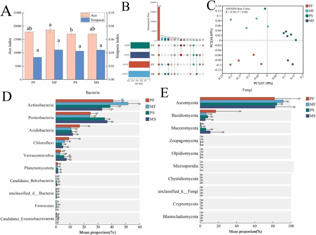 研究显示,α多样性分析显示,MF的微生物α多样性(Ace指数)高于PS(P< 0.05;图1A)。然而,辛普森指数显示不同组间无显著差异。在微生物多样性方面,MF(24,647种)招募的微生物种类数量最多,其次为PF(24,102种)、MS(22,522种)和PS(22,204种)(图1B)。在PF中招募的独有物种数量最高,其次是MF、PS和MS。主成分分析表明,PF与PS、PF与MS、PS与MF、MF与MS的根际微生物群落之间存在显著差异(图1C和表S4)。然而,PF和MF、PS和MS的微生物群落结构之间没有显著差异。与PF相比,PS导致多种微生物的相对丰度存在显著差异,而混栽引起的微生物相对丰度存在显著差异的种类则较少(图S2)。