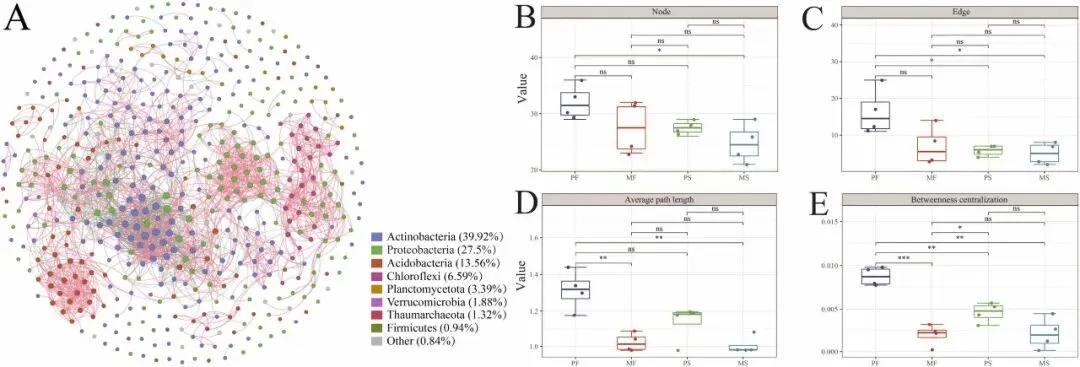 微生物共现网络分析显示,放线菌门在网络中占主导地位,占总连接的39.92%(图2A)。与PF相反,PS的网络边数显著减少,表明微生物网络互连性较低(图2B)。MF和MS的共现网络平均连接长度比PF短,表明微生物间相互作用更加高效。此外,MF、PS和MS中的中介中心势(衡量网络中某些节点重要性的指标)低于PF。