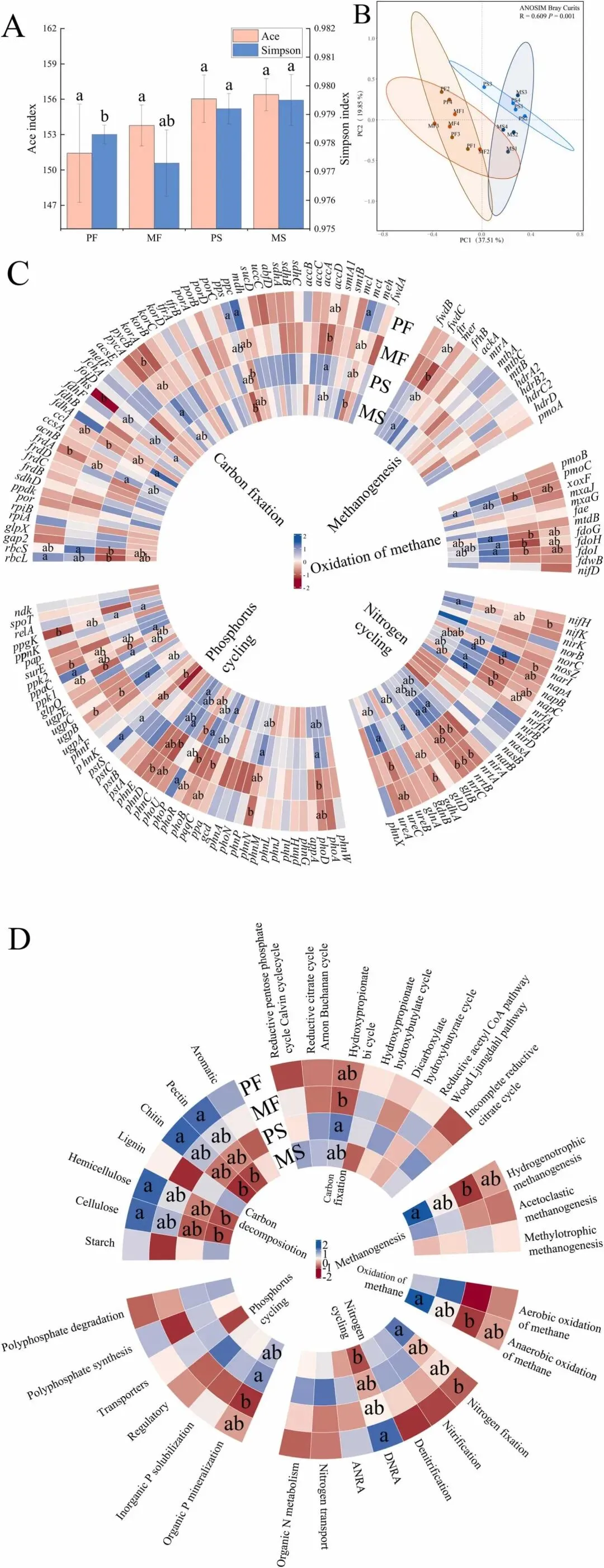 基因多样性分析显示,PS的基因多样性(辛普森指数)高于PF(P < 0.05),尽管各组之间的基因丰富度(Ace指数)差异不显著(图3A)。基因多样性和丰富度在单一种植和混栽人工林之间无差异。基于基因丰度的主成分分析表明,与PF和MF相比,PS林形成了独特的群落基因结构(图3B)。差异基因分析显示,与PS相比,PF中与碳固定相关的基因(rbcL、ppc)和磷循环相关的基因(phoP、ppk2)的丰度更高,但与碳固定相关的基因(frdA、pycB)、氮循环相关的基因(nrtA、nrtB、nrtC和gdhA)以及磷循环相关的基因(phnN、ugpB和ppgK)的丰度较低(图3C)。与MF相比,PS中与碳固定相关的基因(accD)、甲烷氧化相关的基因(fdoG、fdoH和fdoI)、氮循环相关的基因(napA、napC、nrfA、nrtA、nrtB和ureC)以及磷循环相关的基因(phoD、phoR、phnC、ugpB和ppk1)的丰度均有所增加,而与碳固定相关的基因(rbcS)的丰度则有所降低。功能分析表明,与PS和MF相比,PF的功能分析结果无显著差异。然而,相较于PS,MF的羟基丙酸酯生物循环和有机磷矿化功能有所降低(图3D)。