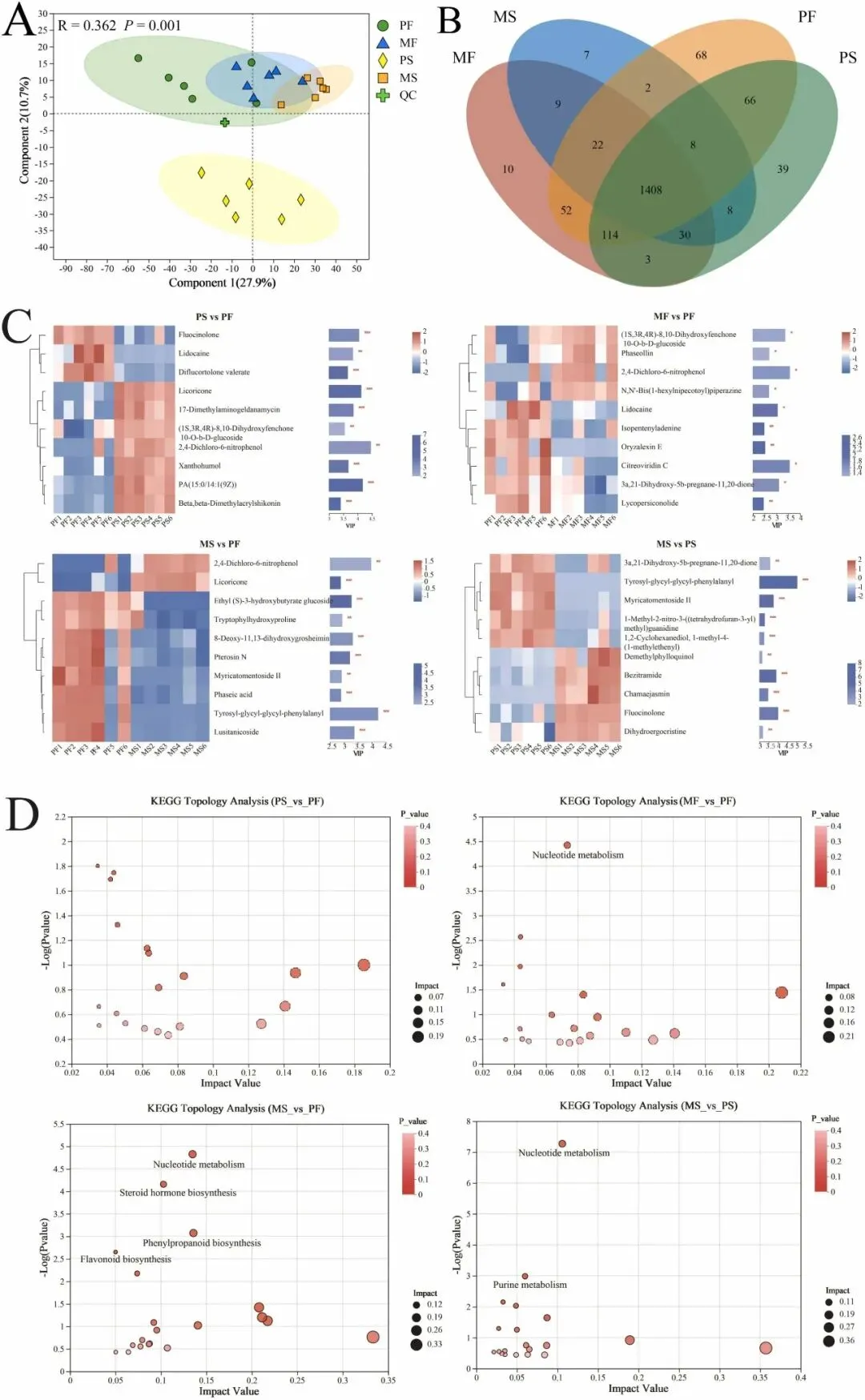 偏最小二乘判别分析显示,PF和PS之间的代谢物谱存在显著分离,PS的代谢物谱也与MF和MS明显不同(图4A和表S5)。在所有实验组中总共鉴定出共有代谢物1408种,PF包含的独有代谢物数量最多(68种),其次是PS、MF和MS(图4B)。与PF相比,PS、MF和MS分别增加了126、68和117种代谢物的数量,同时分别减少了129、162和446种代谢物的数量(图S4)。