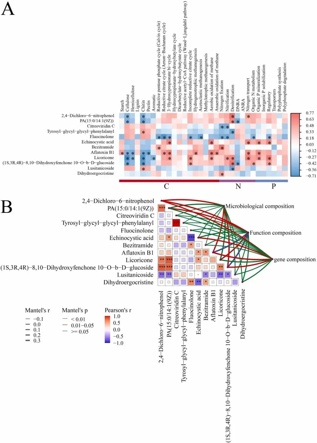 代谢产物双羟氟轻松与C、N和P循环的功能组分之间表现出负相关,而刺囊酸和bezitramide则与这些相同的功能成分表现出正相关(图5A)。已识别到下列代谢物之间的关联:Lusitanicoside与2,4-二氯-6-硝基苯酚、PA(15:0/14:1 (9Z))、bezitramide、甘草利酮以及(1S,3R,4R)-8,10-Dihydroxyfenchone10-O-β-D-葡萄糖苷呈负相关(图5B)。甘草利酮与2,4-二氯-6-硝基苯酚、PA(15:0/14:1(9Z))和刺囊酸显示出正相关。在微生物群落、功能和代谢物组成的更广泛分析中,2,4-二氯-6-硝基苯酚、黄曲霉毒素B1和(1S,3R,4R)-8,10-Dihydroxyfenchone10-O-β-D-葡萄糖苷与微生物组成正相关。