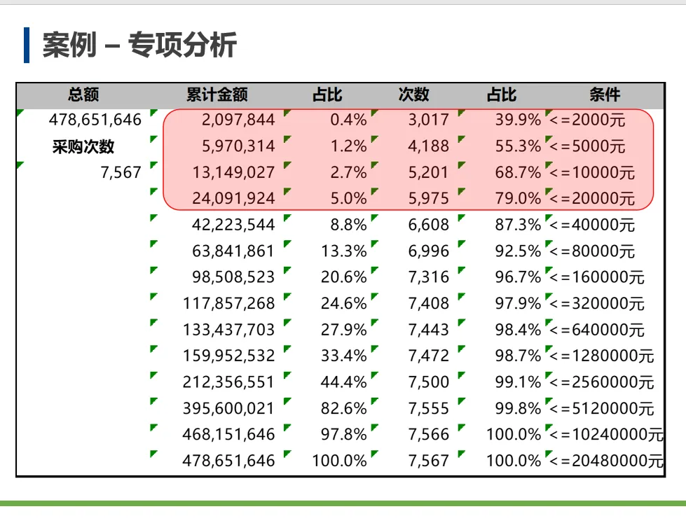 1、大部分时间(采购次数占比:39.9%)都用来审批2000元以下的采购订单(采购金额占比:0.4%),“投入”与“产出”不成比例。