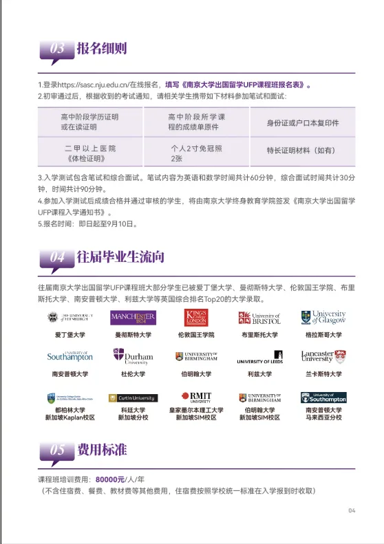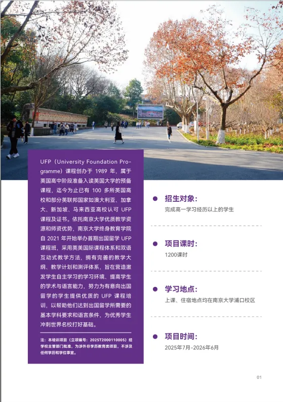 依托南京大学优质教学资源和师资优势,南京大学终身教育学院自2021年开始举办首期出国留学UFP课程班,采用英美国际课程体系和双语互动式教学方法,拥有完善的教学大纲,教学计划和评测体系,旨在营造激发学生自主学习的学习环境,提高学生的学术与语言能力,努力为有意向出国留学的学生提供优质的UFP课程培训,以帮助他们达到出国留学所需要的基本学科要求和语言条件,为优秀学生冲刺世界名校打好基础。