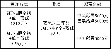 活动期间,凡在南京市福利彩票销售点购买双色球,对采用“红球4胆全拖+单个蓝球”投注(812元)且中得双色球二等奖的彩票,额外赠送中奖彩民和售票站点各五千元彩票(电脑票或即开票);对采用“红球5胆全拖+单个蓝球”投注(56元)且中得双色球二等奖的彩票,额外赠送中奖彩民五千元彩票(电脑票或即开票)。倍中倍送。