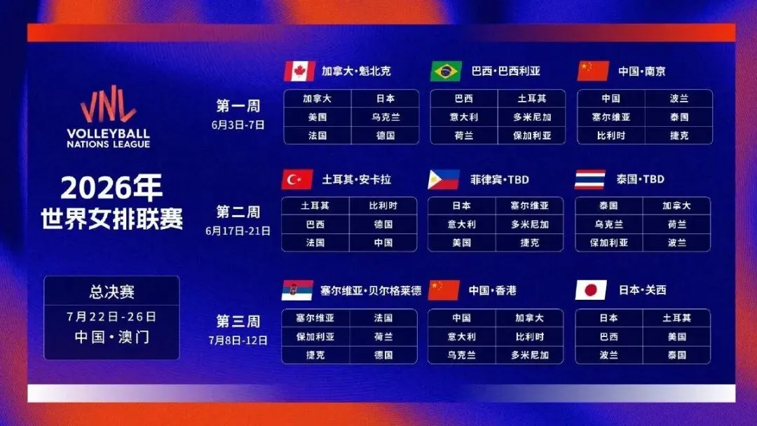 点上方蓝色字“南京乐活通”免费关注近日,国际排联公布了2026年世界女排联赛(VNL)分站赛赛程。中国女排将先后参加中国南京、土耳其安卡拉、中国香港站的比赛。