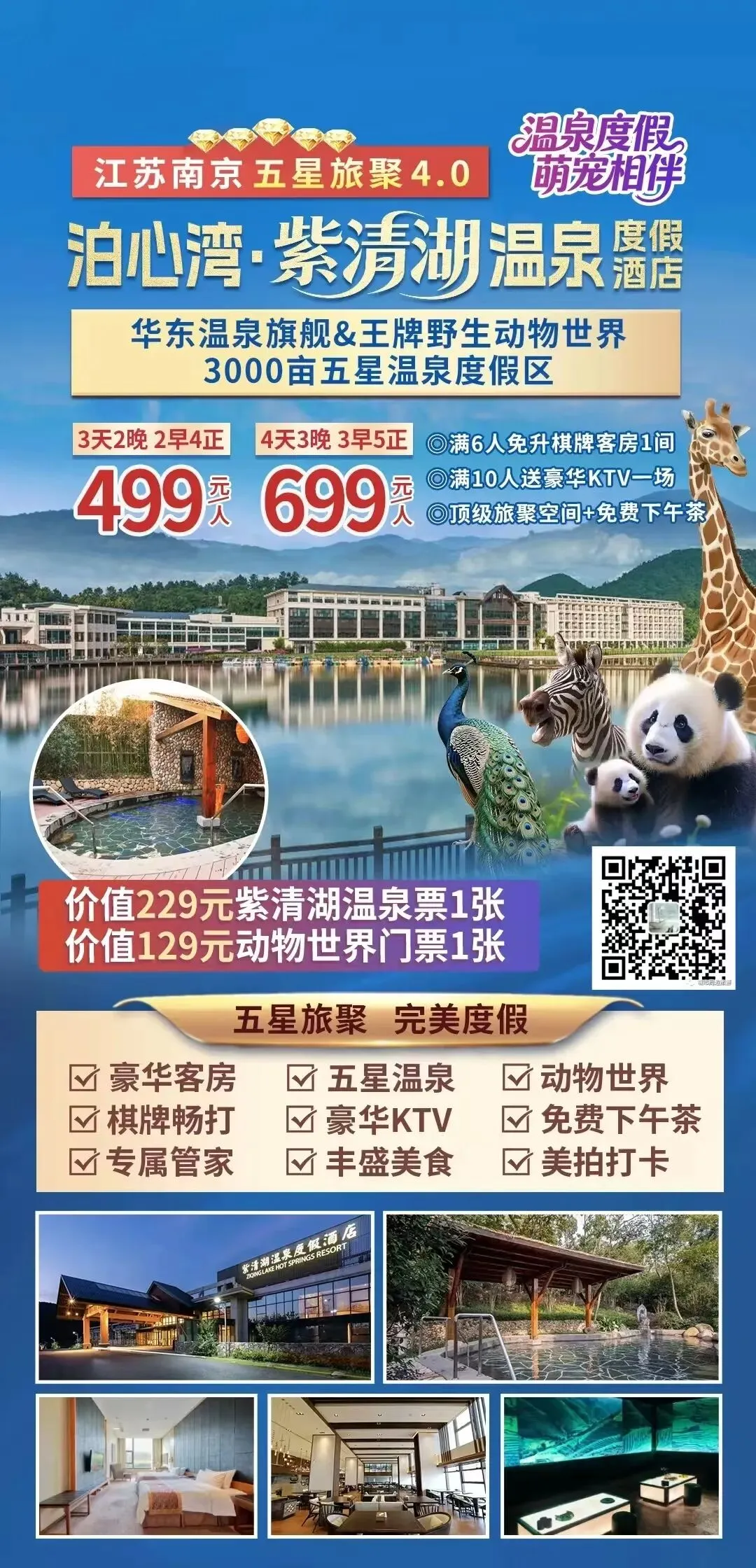 汤山温泉●五星度假【泊心湾·江苏南京紫清湖温泉度假酒店】3天2晚499元/人起●含2早4正●享棋牌客房畅打●豪华KTV●森林温泉+动物园门票