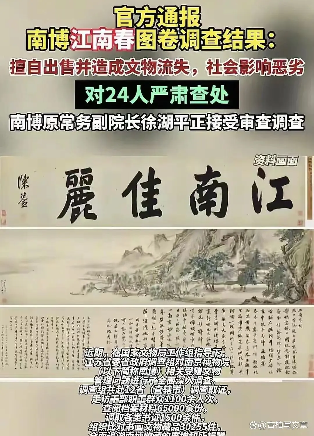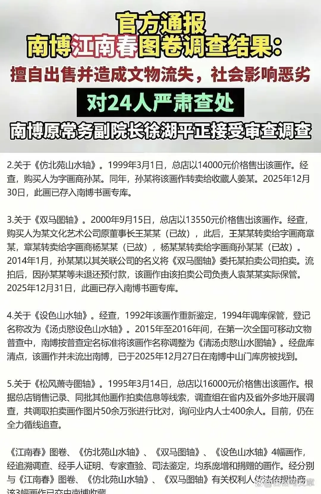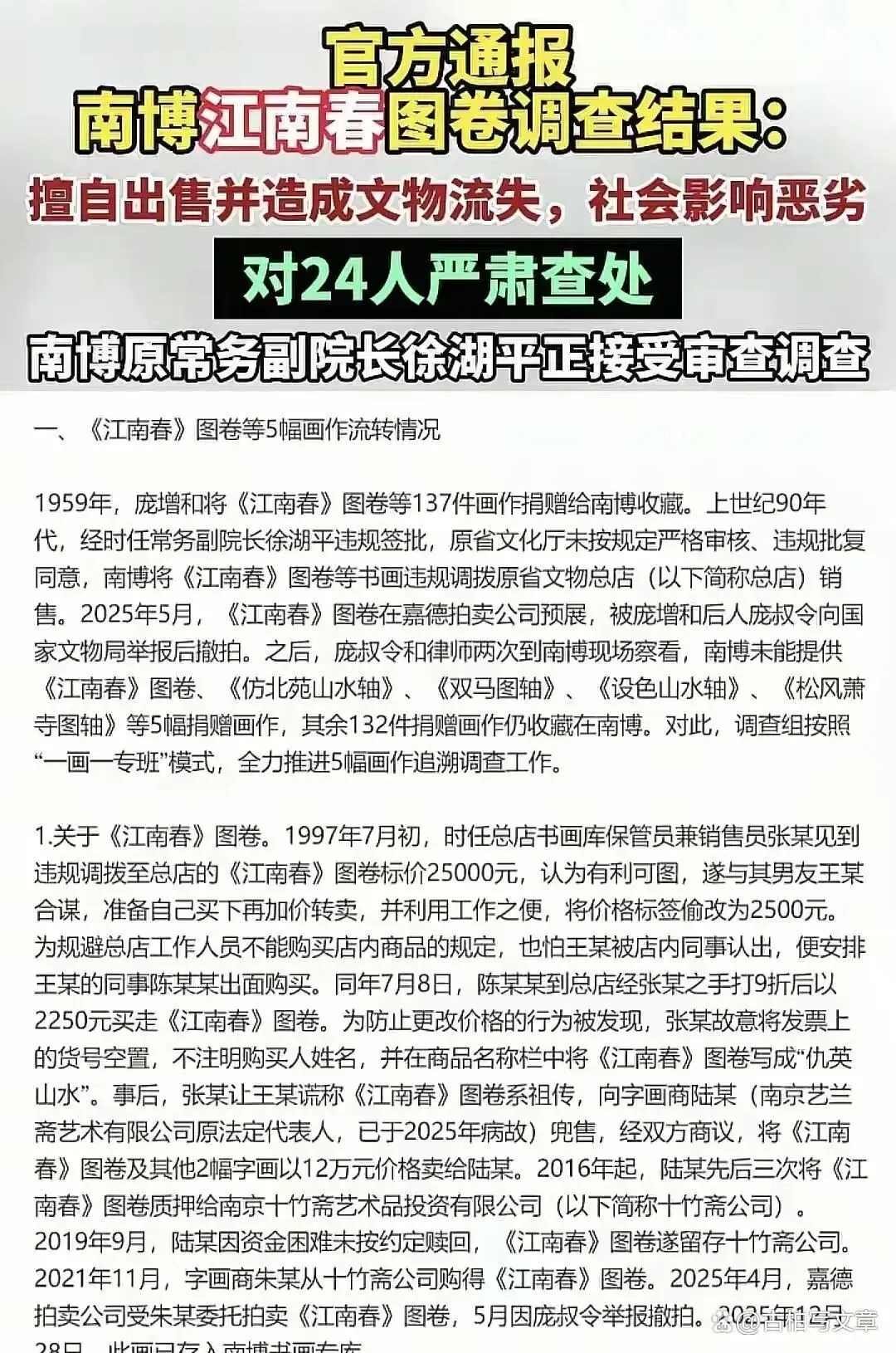 2025年5月,《江南春》图卷突然出现在嘉德拍卖预展现场,捐赠人后人庞叔令一看傻了,马上举报到国家文物局。调查组真是拼了,辗转12个省份,查档案查到头昏脑涨,6万多份材料翻遍,见了1100多人,连陈年旧账都扒拉出来。调查下来,五幅画四幅找回来了,《江南春》图卷弄得最曲折,1997年南博文创部张某竟然把标价从两万五搞成2500元,找关系买下,还九折,几番倒手后到朱某手里,差点被卖成拍品,最后因为举报撤拍,年底才追回回到南京博物院专库。