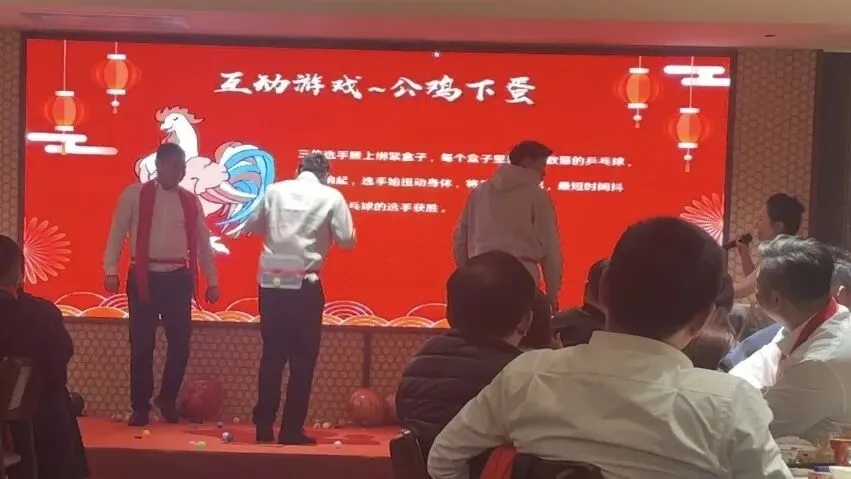 三位选手腰上绑紧盒子,每个盒子里装同等数量的乒乓球,音乐响起,选手始扭动身体,将乒乓球抖出,最短时间抖出所有乒乓球的选手获胜。