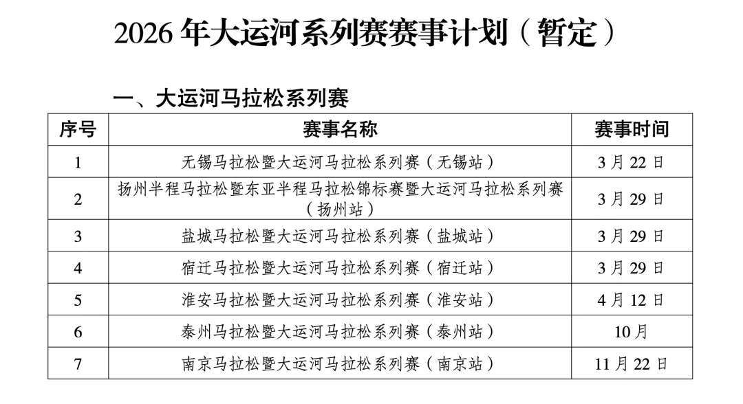 江苏省体育局在官网发布了大运河马拉松系列赛的赛事计划,2026年共包含7场马拉松赛事,包括无锡马拉松、扬州半马、盐城马拉松、宿迁马拉松、淮安马拉松、泰州马拉松、南京马拉松。