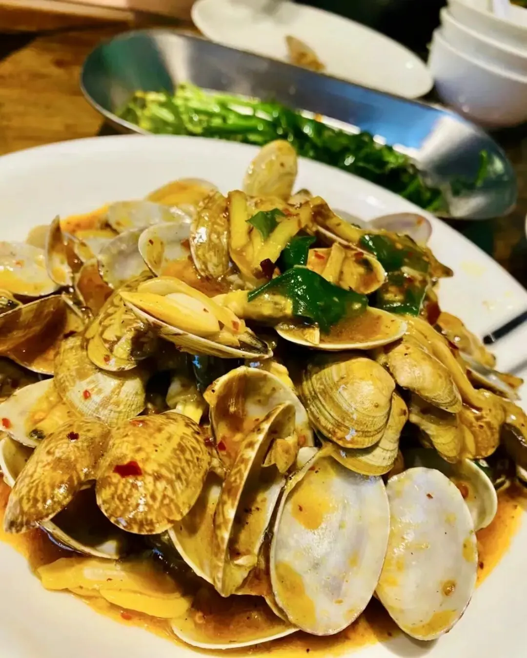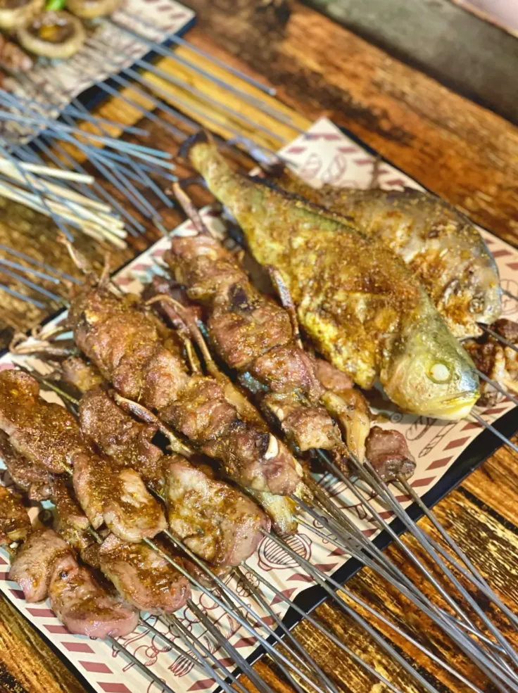 由于几乎所有食材都是当天现买,你在这里吃烧烤几乎吃不到腌制已久的成品。像一整根牛肉条串成的“牛肉串”几乎人人必点。而像花甲、龙虾等盘菜,也几乎是大桌必点的存在。