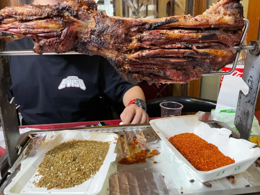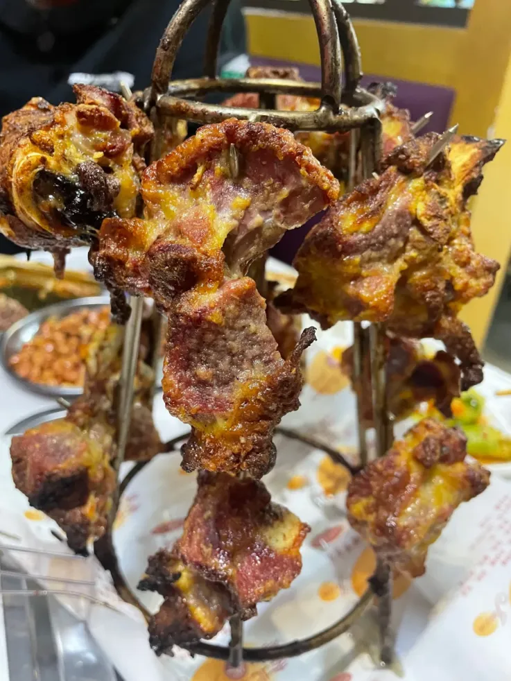 这个按斤称,挂在铁架上烤制。一口咬下酥酥嫩嫩,淡淡的羊膻绝对可以接受,最关键的是那大口吃肉的快感,让你有了一种当水浒好汉的感觉。