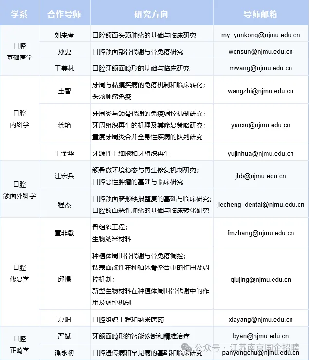 7. 临床博士后:原则上近5年以第一作者或通讯作者(含共同通讯)在JCR 2区及以上期刊发表至少1篇科研论著。临床博士后由南京医科大学附属口腔医院负责招聘和考核。